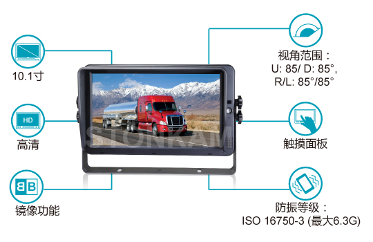 10.1寸高清車載監(jiān)控觸控屏系統(tǒng),采用電容式觸摸屏操作,亦可使用紅外遙控;支持4路1080P高清攝像頭模擬輸入,9種菜單語言可選,多種視頻格式可供選擇。