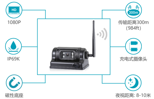 敏視高清車用無線倒車影像攝像頭底盤帶有強力磁鐵,安裝簡單方便。具備可充電電池,可通過電池供電;空曠傳輸距離遠達300m(984ft),信號穩(wěn)定抗干擾。此外,這款車用無線攝像頭防水防塵等級達IP69K,同時具備夜視功能,可靠性高,適用性廣,可廣泛應用于貨運車、吊車、挖機、農(nóng)用車等多種車型。
