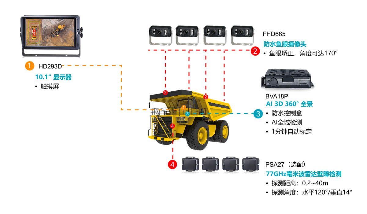 3D 360°全景監(jiān)控系統(tǒng),實(shí)現(xiàn)車輛周邊無死角監(jiān)控,AI識(shí)別人車主動(dòng)預(yù)警,并可搭載雷達(dá)彌補(bǔ)視覺不足,在粉塵、黑暗等環(huán)境下增強(qiáng)目標(biāo)檢測,提升安全。