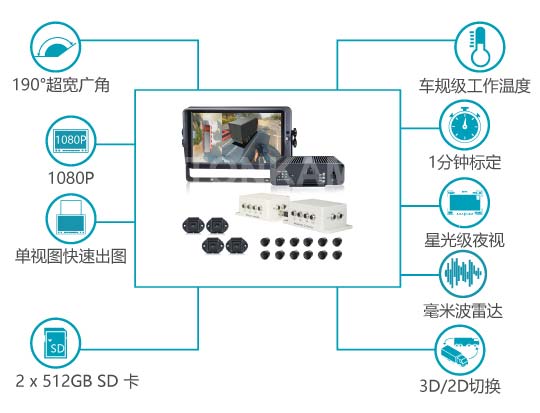 敏視360°全景駕駛輔助系統(tǒng)&全景影像系統(tǒng)能夠?qū)崿F(xiàn)真正的360°全景鳥瞰,做到360°無死角監(jiān)控,行車更安全。它支持全景影像合成技術(shù),塑造3D行車場景。專為卡車,公交車,應(yīng)急車輛等設(shè)計,易于安裝和標(biāo)定。若與雷達(dá)探測系統(tǒng)結(jié)合使用將會大大有效提高行車安全性。