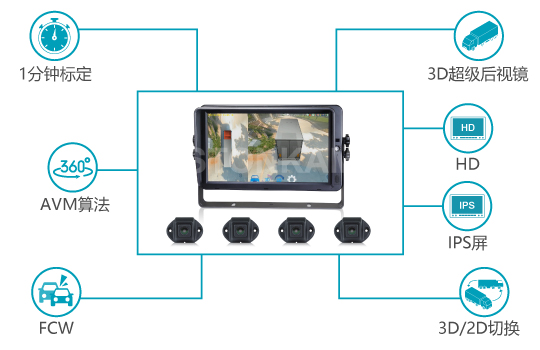 360度全景影像一體機(jī)集成AVM算法,無(wú)需控制盒即可實(shí)現(xiàn)全景行車(chē)圖像,讓出行360°沒(méi)有盲點(diǎn)。自動(dòng)標(biāo)定僅1分鐘,并支持自動(dòng)平面校正,省時(shí)省力??山Y(jié)合雷達(dá)使用,為卡車(chē)、公共交通、應(yīng)急車(chē)輛的行駛增添安全保障。