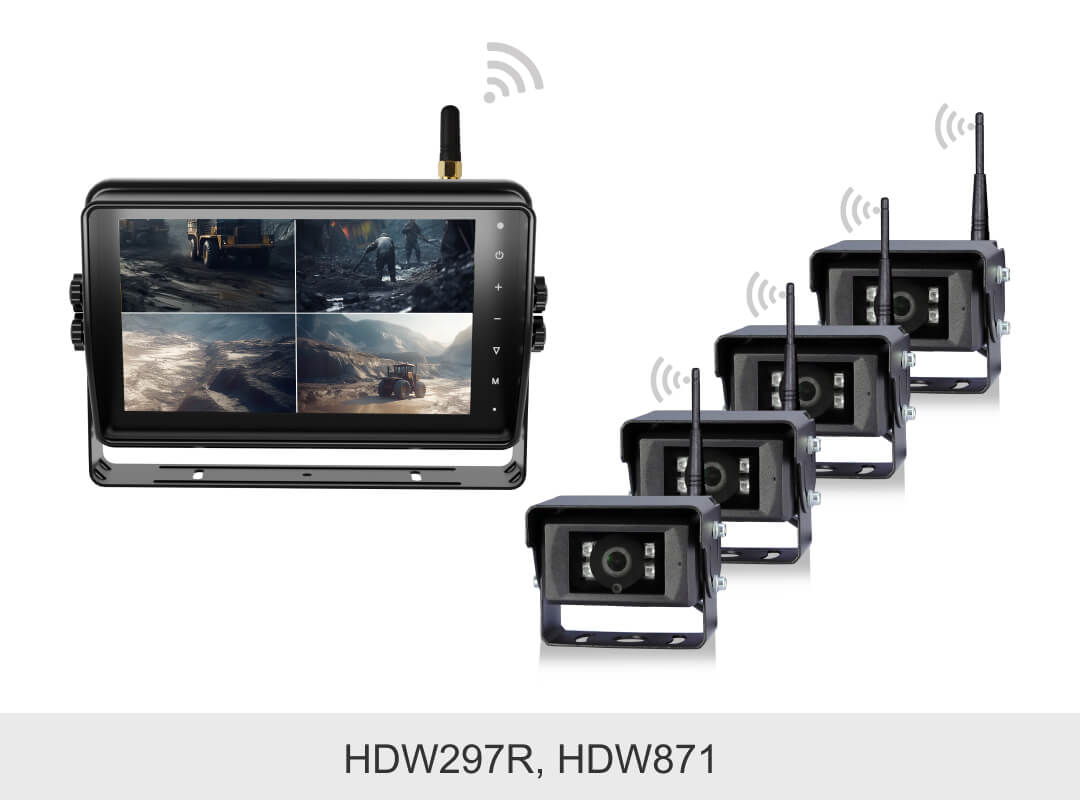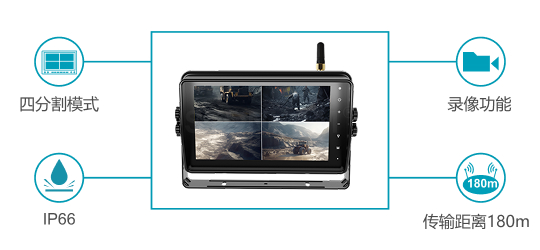 敏視10.1寸高清無線四分割車載錄像監(jiān)控顯示器具有IP66防水外殼,配備錄像和觸屏功能;空曠傳輸距離最遠(yuǎn)達(dá)180m,信號(hào)穩(wěn)定抗干擾,支持多畫面顯示模式,適用于卡車,叉車,礦車等各種車輛。