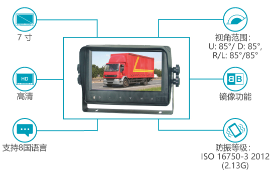 7寸高清數(shù)字液晶車載顯示器,采用大視角高分辨率TFT數(shù)字液晶顯示屏。圖像可上下翻轉(zhuǎn)、原鏡像可調(diào)。支持8國語言。支持多種制式自動識別:1080P30/1080P25/720P30/720P25/PAL/NTSC。支持自動亮度調(diào)節(jié)。具備全部功能的遙控器。支持觸摸按鍵,帶背光。顯示器帶揚聲器, 用戶可從控制面板調(diào)節(jié)聲音等等。