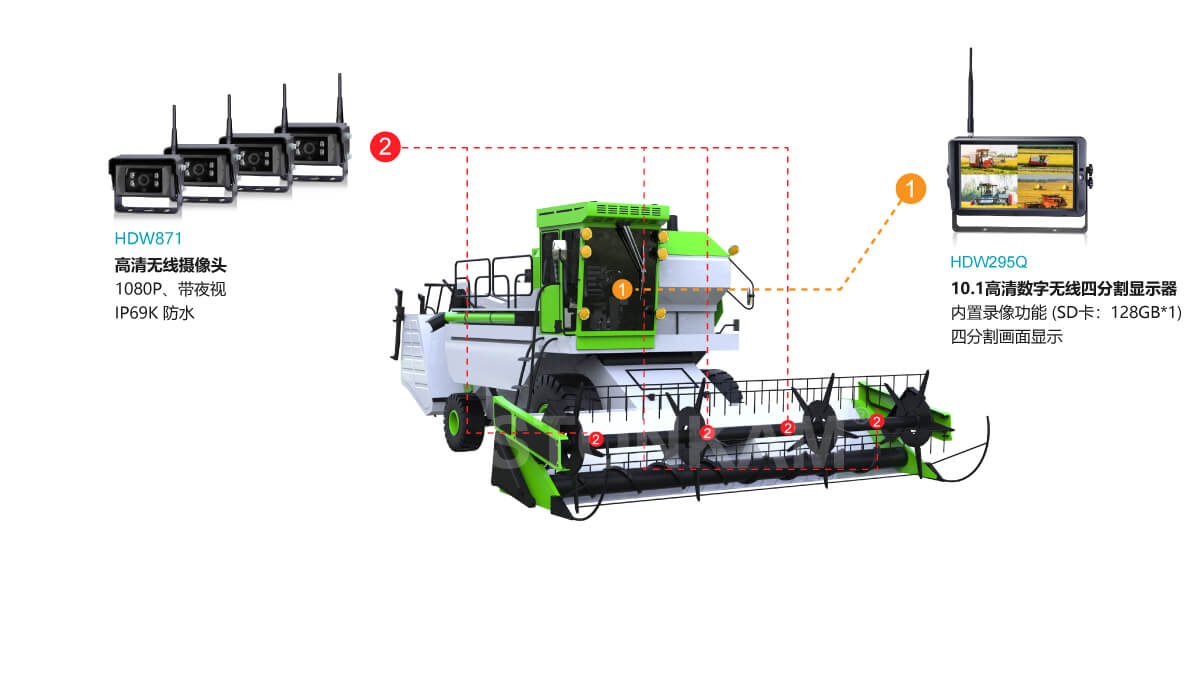 農(nóng)場(chǎng)作業(yè)中,播種機(jī)、拖拉機(jī)和收割機(jī)等大型農(nóng)業(yè)機(jī)械常面臨駕駛員視野受限的挑戰(zhàn):車周及關(guān)鍵作業(yè)部位存在盲區(qū),夜間或惡劣天氣下更難掌控全局,容易發(fā)生碰撞或誤操作;同時(shí),播種行、掛接狀態(tài)及收割作業(yè)點(diǎn)難以實(shí)時(shí)監(jiān)控,作業(yè)調(diào)整滯后,效率低下且資源浪費(fèi)嚴(yán)重。這些痛點(diǎn)直接影響作業(yè)安全與生產(chǎn)效益,是現(xiàn)代農(nóng)場(chǎng)亟需解決的核心問(wèn)題。