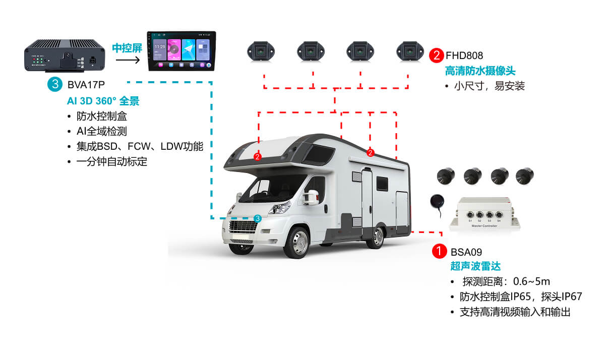 360全景環(huán)視系統(tǒng)提供車周全景實(shí)時(shí)監(jiān)控,AI識(shí)別人車主動(dòng)預(yù)警,并搭載超聲波雷達(dá)實(shí)時(shí)探測(cè)障礙物,提前預(yù)警,顯著提升駕駛安全性與操控便捷性。